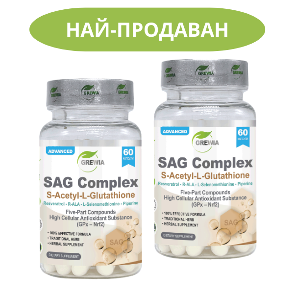 SAG Complex GPx е висококонцентриран петчастен антиоксидантен комплекс с марка Grewia, в синергична формула от 60бр капсули, съчетаваща едни от най-мощните и ключови естествени антиоксиданти като (SAG) S-Ацетил-L-Глутатион /S-Acetyl-L-Glutathione ≥95.0 to ≤105.0% UV white crystal natural purity powder/, Ресвератрол от екстракт Японска фалопия (корен) /Polygonum cuspidatum Natural Resveratrol 98% HPLC/ – доставящ 98% натурален чист Транс Ресвератрол, R-Алфа Липоева киселина R-ALA/R-Alpha Lipoic Acid Crystalline Powder 100.0% HPLC/, L-Селенметионин /L-Selenomethionine – Se 2.5%/ и Биоперин екстракт от черен пипер /Piper nigrum fruit extract pure – 100% HPLC pure – standardized to 95% Piperine/ – разработена за максимална клетъчна защита, енергийна поддръжка и оптимална детоксикация като осигурява широкоспектърно действие и синергично усилва антиоксидантния потенциал на организма, допринася за поддържане на нормалния редокс баланс и вътреклетъчната антиоксидантна защита чрез подпомагане на глутатион-зависимите механизми. Формулата подпомага физиологичните процеси на детоксикация в черния дроб, защитава клетките от оксидативен стрес и подкрепя митохондриалната функция и енергийната обмяна. Повишава бионаличността и поддържането на общата клетъчна хомеостаза и механизми, свързани със забавянето на клетъчното стареене.