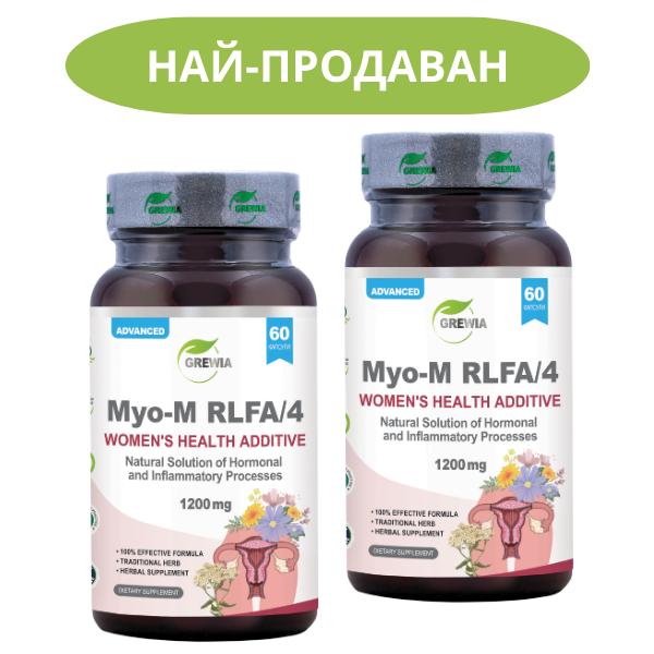 Myo-M – RLFA/4 – 1200mg е иновативна и натурална комплексна добавка с марка Grewia, в синергична и високоефективна формула от 60бр капсули, съчетаваща подбрани активни съставки като растителни екстракти, минерали, антиоксиданти и витамини като Екстракт Бял равнец /Achillea millefolium L. extract – 92% HPLC/, Екстракт Витекс / Аврамово дърво /Vitex agnus castus extract 80% Mesh 0.5% Agnuside 0.6% Aucubin TLC/, Екстракт Червена Детелина /Trifolium pratense L.- Red Clover leaves extract/, Екстракт Полски хвощ /Equisetum arvense L. extract 80.0% HPLC/, Екстракт Овчарска торбичка /Herba bursae pastoris L.extract 92.00% TLC purity/, Екстракт Турта /Tagetes erecta L. 98% UV&GC flower extract – source of Lutein/, Екстрат от Невен /Calendula officinalis L.extract orange fine powder 95%UV purity/, EGCg Епигалокатехин галат от екстракт Зелен чай /Epigallocatechin gallate from Camellia sinensis L. extract/, Желязо като ферозен фумарат /Iron as Ferrous fumarate) ≥99% pure composition/, Витамин C – L-Аскорбинова киселина /Vitamin C – L-Ascorbic acid 99.00% IU/, Фолиева киселина Витамин В9 /Folic Acid – Vitamin B9 98% IU/, Витамин D3 Холекалциферол /Cholecalciferol 90%UV – доставящ 400IU/, Витамин К2 като Менахинон-MK-7 /Vitamin K2 – Menachinon MK-7/, Витамин Е Dl/Алфа токоферил /Vitamin E Dl-Alpha Tocopheryl Acetat 98.4 % IU/, Витамин В12 като Цианокобаламин /Cyanocobalamin – Vitamin B12 – 0.12%/, Молибден (Mo) като Молибденов хелат /Molybdenum chelate 99.90% UV Pure/, Ликопен /Lycopersicon esculentum extract – Lycopene 17% IU/, L-Селенметионин /L-Selenomethionine – Se 2.5%/ – които действат ефективно за поддържане на нормален хормонален баланс, менструален комфорт и репродуктивна функция при жените. Комбинацията от фитоестрогени, антиоксиданти и минерали действа в синергия с доказан ефект върху ендокринната, сърдечно-съдовата и имунната система. Въздейства за ограничаване растежа на миоматозни образувания, способства за  намаляване на  възпалението и хормоналната чувствителност на маточната тъкан, като същевременно подкрепя детоксикацията на черния дроб, енергийния метаболизъм и засилва естествените и подържащи процеси в тялото.