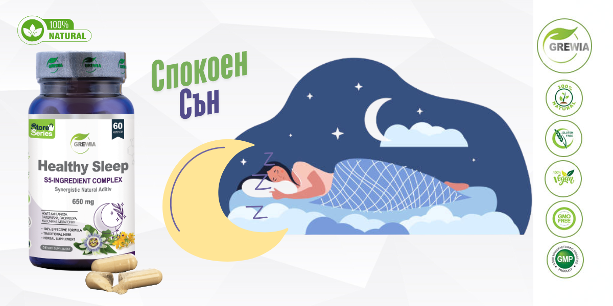 Healthy Sleep – S5 – 650mg е иновативна, натурална и високoусвоима добавка с марка Grewia, във високоефективна формула от 60бр капсули, съчетаваща състав с бърза абсорбция и висока биологична активност от Екстракт от Жълт кантарион (надземни части) /Hypericum perforatum L. extract – St. John’s Wort – 0.3% hypericin/ – стандартизиран до 0.3% Хиперицин, Екстракт Валериана (корен) /Valeriana officinalis L. root extract 80% HPLC/, Екстракт Пасифлора (цвят и въздушна част) /Passiflora Incarnata L.- 80%UV extract/, Екстракт Маточина (листа) /Melissa officinalis L. leaf extract powder -90.61% HPLC / и Мелатонин /Melatonin – 99% Pure Composition/ – високоефективна комбинация в балансирано съчетание за подпомагане на естествения сън, съкращаване времето за заспиване, баланс на нервната система, намаляване тревожността, напрежението и качествената нощна регенерация. Комплексът комбинира пет доказани активни съставки – стандартизирани растителни екстракти и чист мелатонин – с цел бързо успокояване, улеснено заспиване, по-дълбок възстановяващ сън и намаляване нощните събуждания. Подпомага настроението и регулира стреса. Подкрепя организма при отпадналост и умора