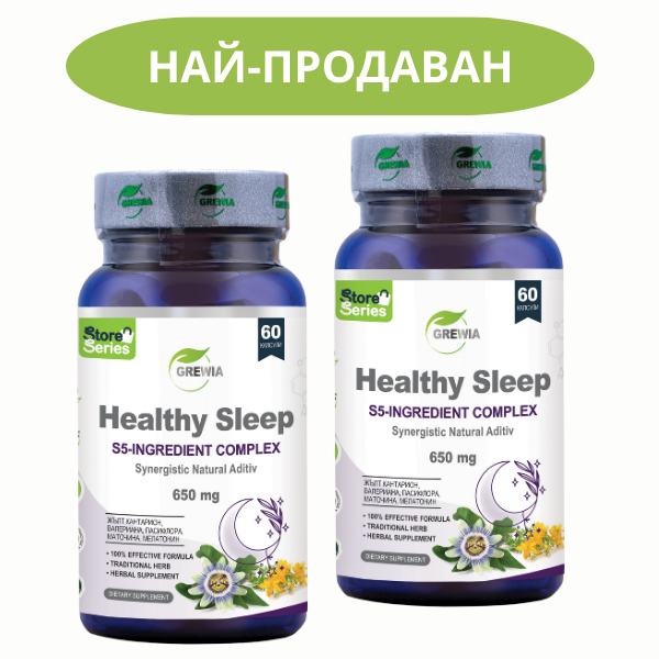 Healthy Sleep – S5 – 650mg е иновативна, натурална и високoусвоима добавка с марка Grewia, във високоефективна формула от 60бр капсули, съчетаваща състав с бърза абсорбция и висока биологична активност от Екстракт от Жълт кантарион (надземни части) /Hypericum perforatum L. extract – St. John’s Wort – 0.3% hypericin/ – стандартизиран до 0.3% Хиперицин, Екстракт Валериана (корен) /Valeriana officinalis L. root extract 80% HPLC/, Екстракт Пасифлора (цвят и въздушна част) /Passiflora Incarnata L.- 80%UV extract/, Екстракт Маточина (листа) /Melissa officinalis L. leaf extract powder -90.61% HPLC / и Мелатонин /Melatonin – 99% Pure Composition/ – високоефективна комбинация в балансирано съчетание за подпомагане на естествения сън, съкращаване времето за заспиване, баланс на нервната система, намаляване тревожността, напрежението и качествената нощна регенерация. Комплексът комбинира пет доказани активни съставки – стандартизирани растителни екстракти и чист мелатонин – с цел бързо успокояване, улеснено заспиване, по-дълбок възстановяващ сън и намаляване нощните събуждания. Подпомага настроението и регулира стреса. Подкрепя организма при отпадналост и умора